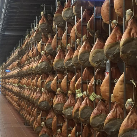 Elk jaar in september openen de prosciuttofici hun deuren onder de noemer ‘finestre aperte’. De 150 producenten van Prosciutto di Parma - allen gelokaliseerd in het oostelijke deel van de provincie Parma, met name in Langhirano - vieren dan het Festival del Prosciutto. Van oudsher worden in deze regio hammen gedroogd. Vroeger gebeurde dit in de buitenlucht of met de ramen open om de zilte zeelucht binnen te laten. Vandaar de naam ‘finestre aperte’. Op deze manier kregen de hammen hun specifieke smaak. De processen zijn nu uiteraard geïndustrialiseerd. Ik heb tijdens ons bezoek in elk geval geen enkel raam open zien staan. De voedselveiligheid heeft daar zonder twijfel ook iets mee te maken. 😊